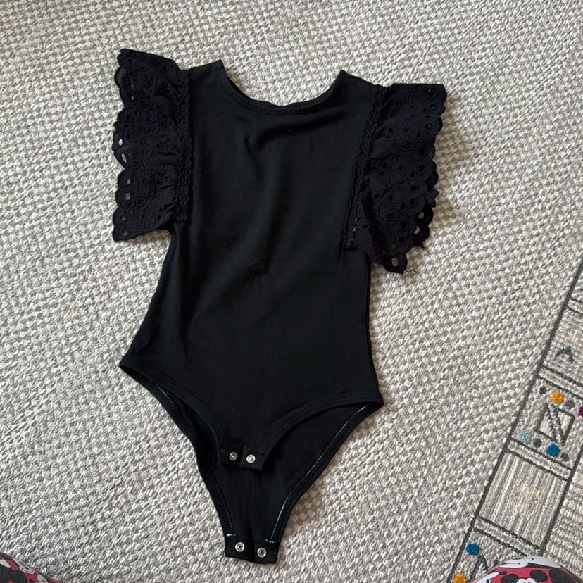 Kısa dantelli kollara ve V yakaya sahip siyah kız bebek body, yumuşak kumaştan üretilmiştir.
