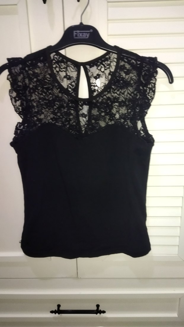 Dantelli ve , kolsuz siyah bluz. Sentetik kumaştan, gövdeye oturan kesime sahip, gotik tarzda. arkada micik bir kusuru var resimde gösterdim neredeyse hiç gözükmüyor küçük bir dikebilirsnz s m uyumludur