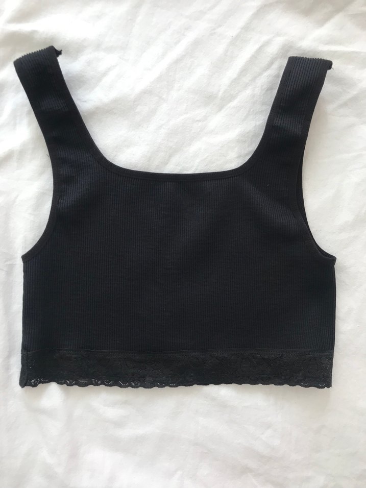 Dantelli etek ucu ve kayık yaka detaylı, siyah kolsuz crop top. Düz ve vücuda oturan kesimiyle minimalist goth tarzına uygundur.
