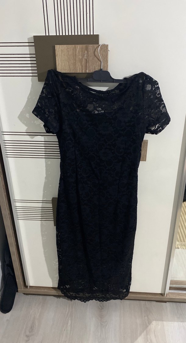 Dantelli, siyah, midi boy, kısa kollu, tek parça ve dar kesim elbise. Gotik tarzda, tek renk ve kayık yaka detaylıdır. Romantik gece için uygundur.
