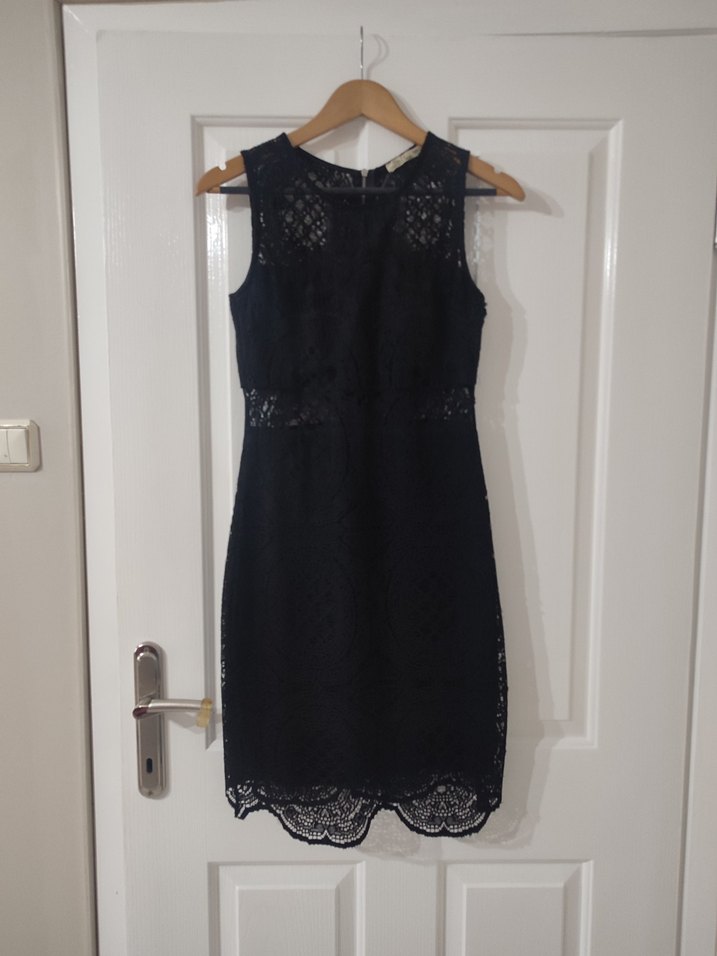 Dantelli, kolsuz siyah midi abiye elbise, vücuda oturan kesimiyle romantik akşamlar için uygun. Klasik ve zarif tarzda.