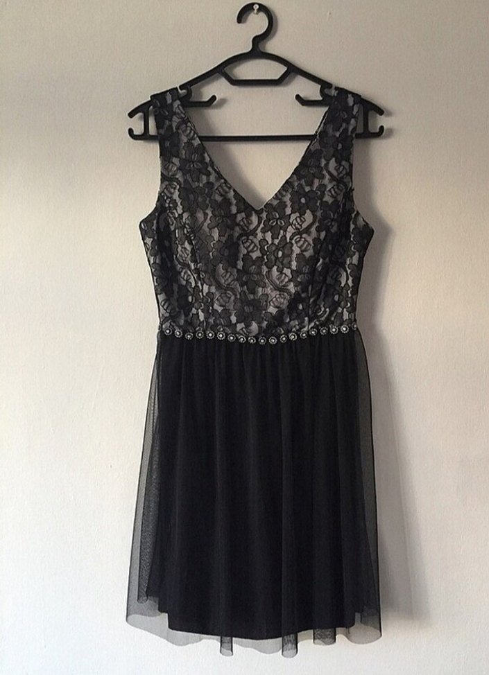 Dantelli üst kısmı ve V yakası olan, kolsuz, siyah midi uzunlukta, klasik ve gotik tarzda abiye elbise. Belinde taş detayları bulunur.