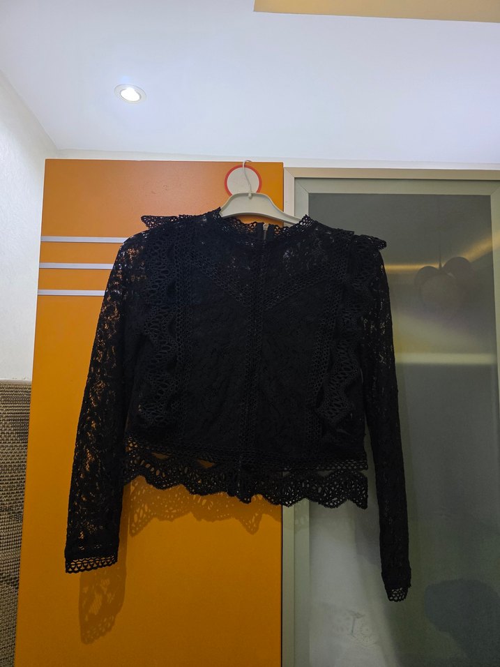 Dar kesim, uzun kollu, yüksek yakalı siyah bluz, işlemeli dantel detaylara sahip dar geldiği için üzülerek satıyorum cok güzel 1 kez giydim maalesef