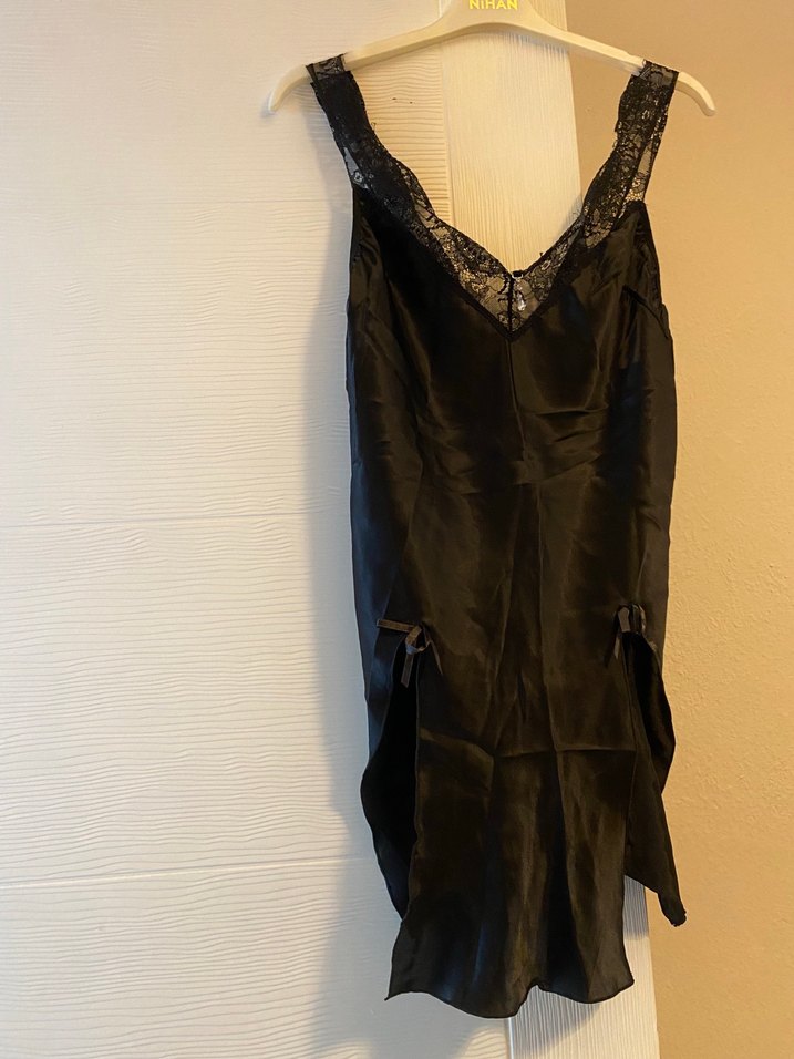 Dantelli yakası ve askılı kollara sahip, siyah vücuda oturan midi uzunlukta gece elbisesi. Önleri yırtmaçlı yıkandı ama giyilmedi duruyordu dolapta