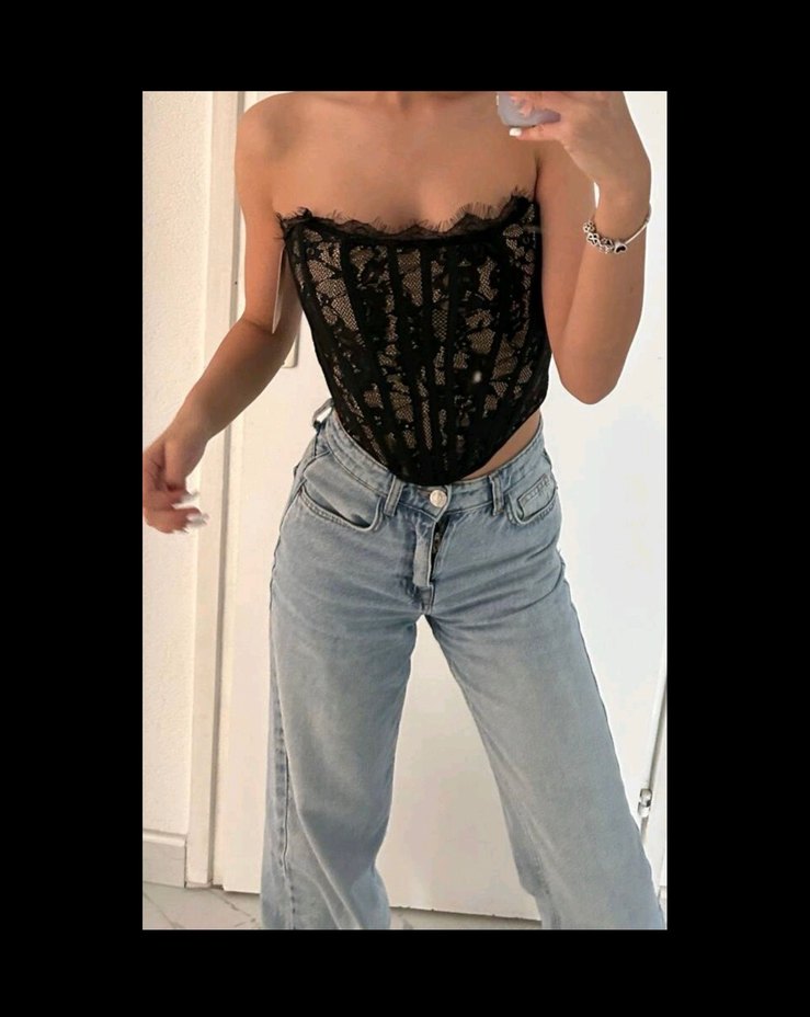 Dantel detaylı, siyah straplez bustiyer, denim kumaştan yapılmıştır. Midi boyda ve günlük kullanım için uygun, sokak tarzı rahat bir üründür.