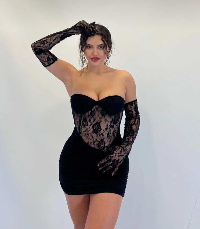 Siyah, straplez yaka ve dantel detaylı, vücuda oturan mini elbise. Gotik tarzıyla romantik gecelere uygun.