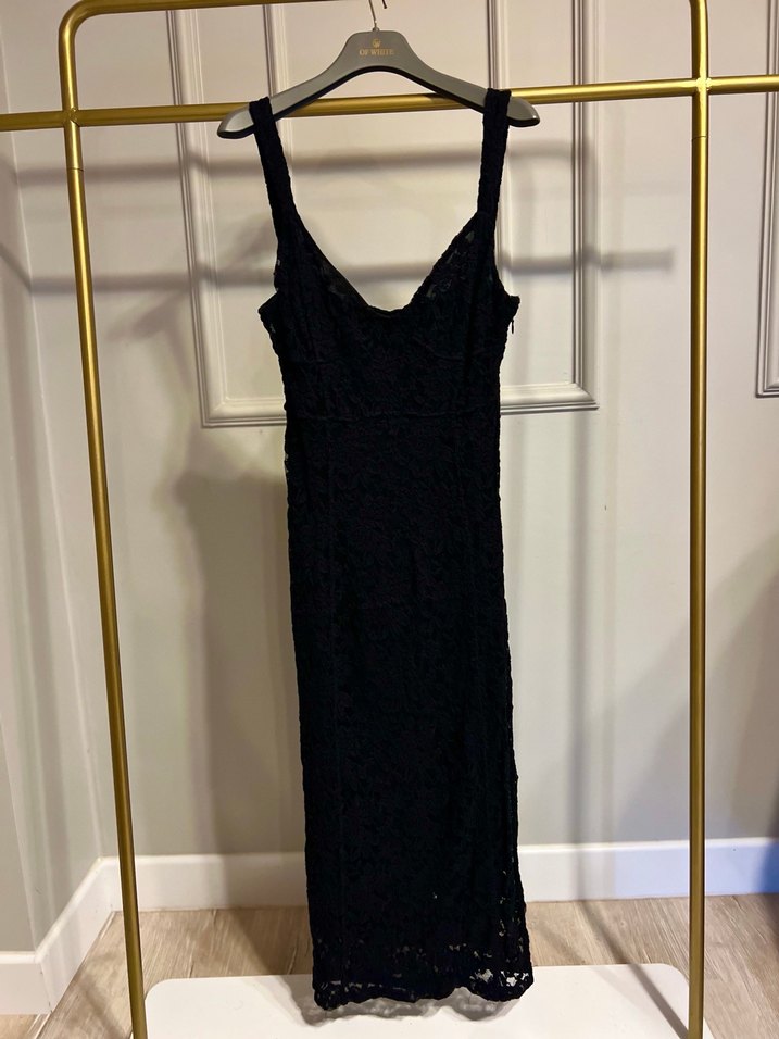 Dantelli, askılı siyah uzun elbise. İpeksi kumaştan, klasik ve gotik Paris tarzını yansıtır, romantik akşamlar için uygundur.