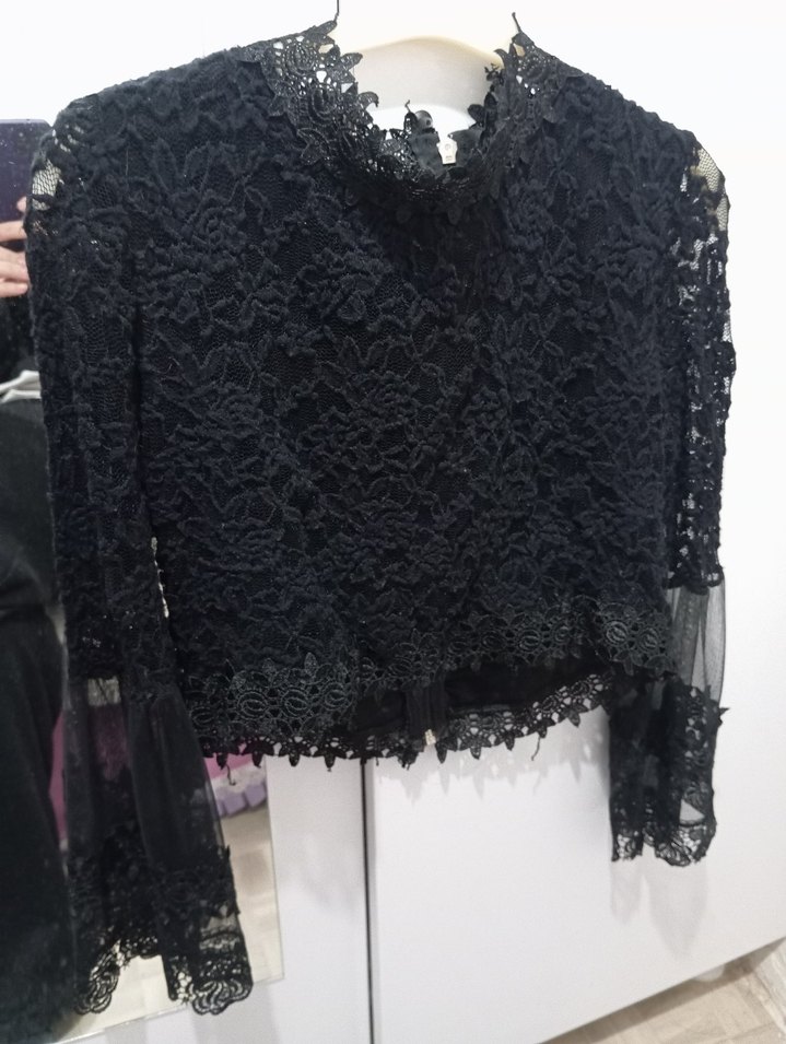 Dantel ve nakış detaylı siyah, yüksek yakalı, uzun kollu, vücuda oturan gotik bluz. Parti için uygun.