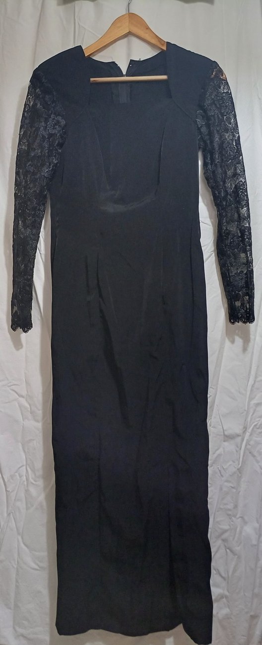 Dantelli uzun kollara ve tek renk siyah kumaşa sahip, vücuda oturan gotik tarzda uzun elbise.