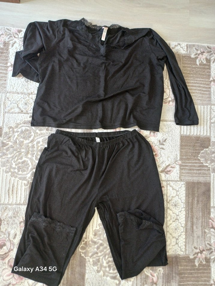 Uzun kollu, V yaka ve dantelli detaylara sahip bol kesim siyah kadın pijama takımı. Rahat ve sade , konforlu bir stil sunar.