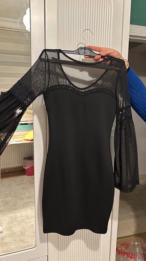 Dar kesim siyah midi elbise, uzun tül kollar, V yakalı ve dantel detaylıdır. Gotik stil ve romantik gece için uygundur.