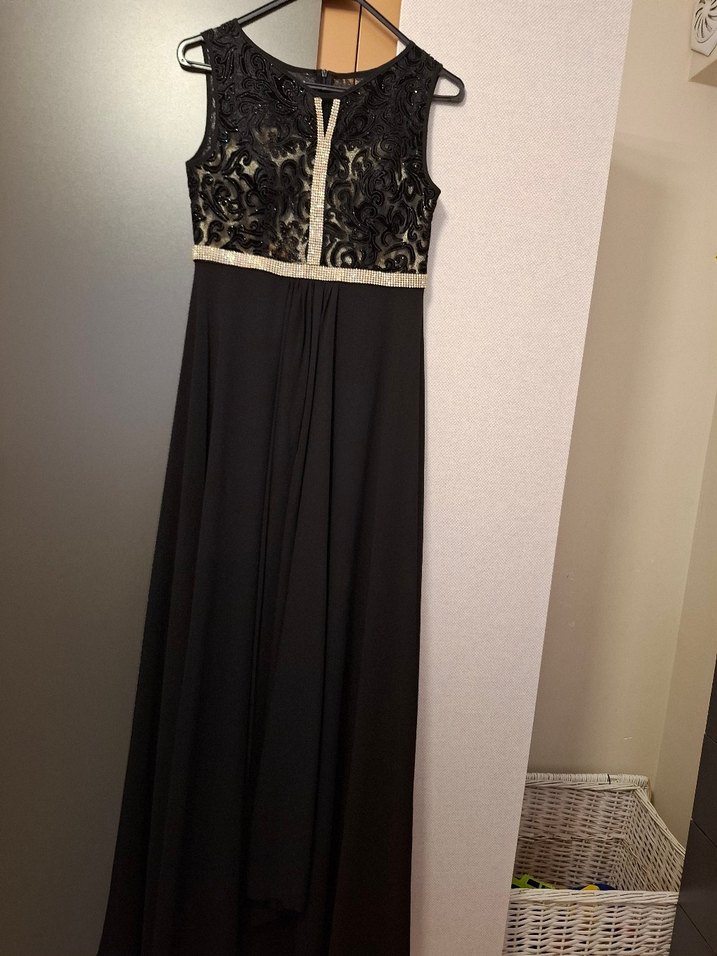 çok şık 38 beden uyumlu ölçü detaylarını görsellerde belirttim V yaka, kolsuz ve dantelli desenlere sahip siyah, fitted uzun abiye elbise. Belinde süslü detay bulunur, düğün için uygun.