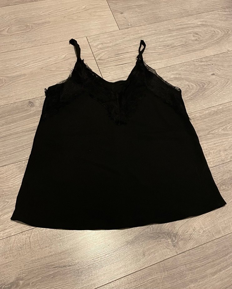 Siyah, dantelli V yaka, kolsuz mini atlet. İpek gibi kumaştan, bol kesim, romantik gece için uygundur.