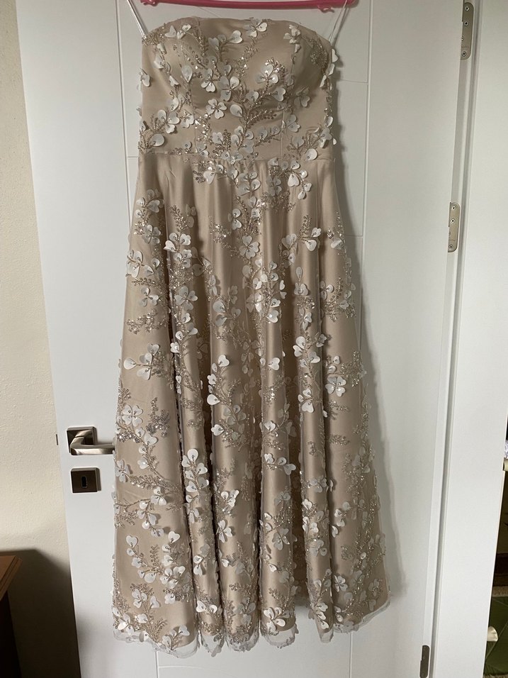 Bej renkte, straplez yaka ve dantelli işlemeli uzun abiye elbise. Salaş kesim ve vintage tarzıyla düğünler için uygun. Alış fiyatı 18.000 bir gün giyildi