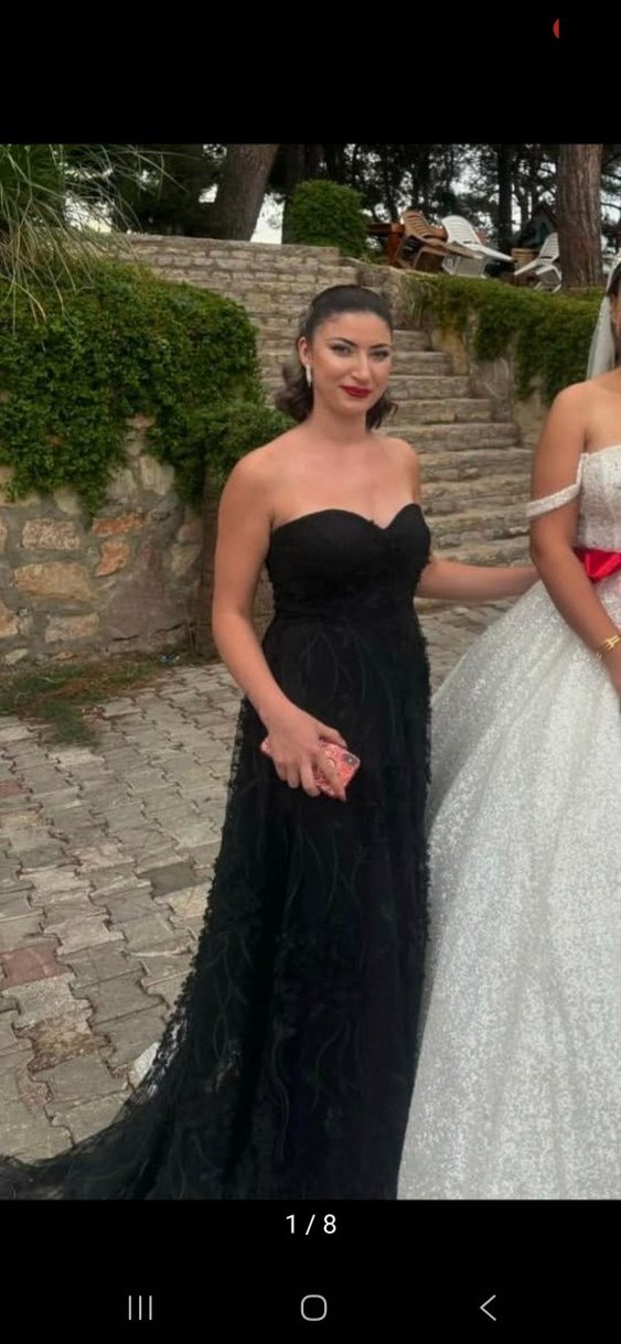 Dantelli ve desenli detaylara sahip, straplez kesim siyah uzun abiye elbise, gotik tarzda klasik şıklık sunar. uzun kuyruklu 38 beden özel olarak dikildi gögus cevresi 96 boy.160
