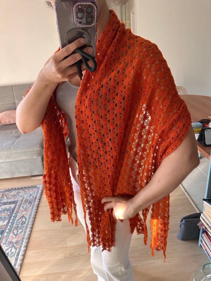 Kadınlar için dantelli triko şal, rahat ve bohem tarzda. retro Örgü detaylı turuncu rengiyle çok dinamik çok az kullanıldı