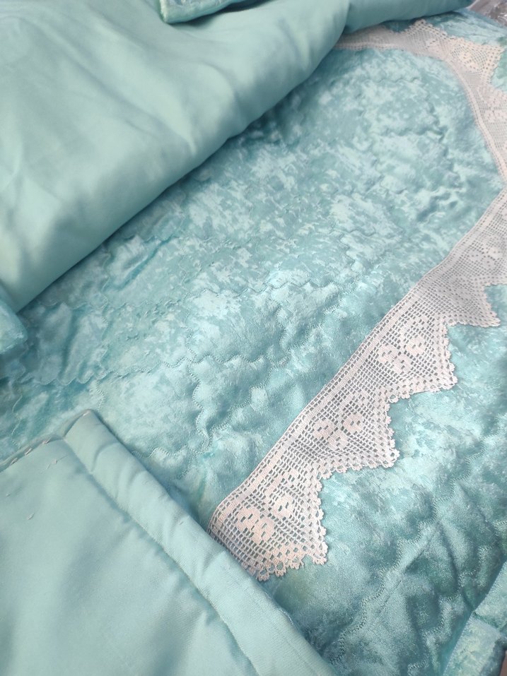 Pastel turkuaz renkte, nakışlı detaylara ve yumuşak dokuya sahip, zarif dantel süslemeli seccade. ️2 adettir fiyat tek adet icin geçerlidir. köpürülmüs dantelli astarlı elyaflı seccade