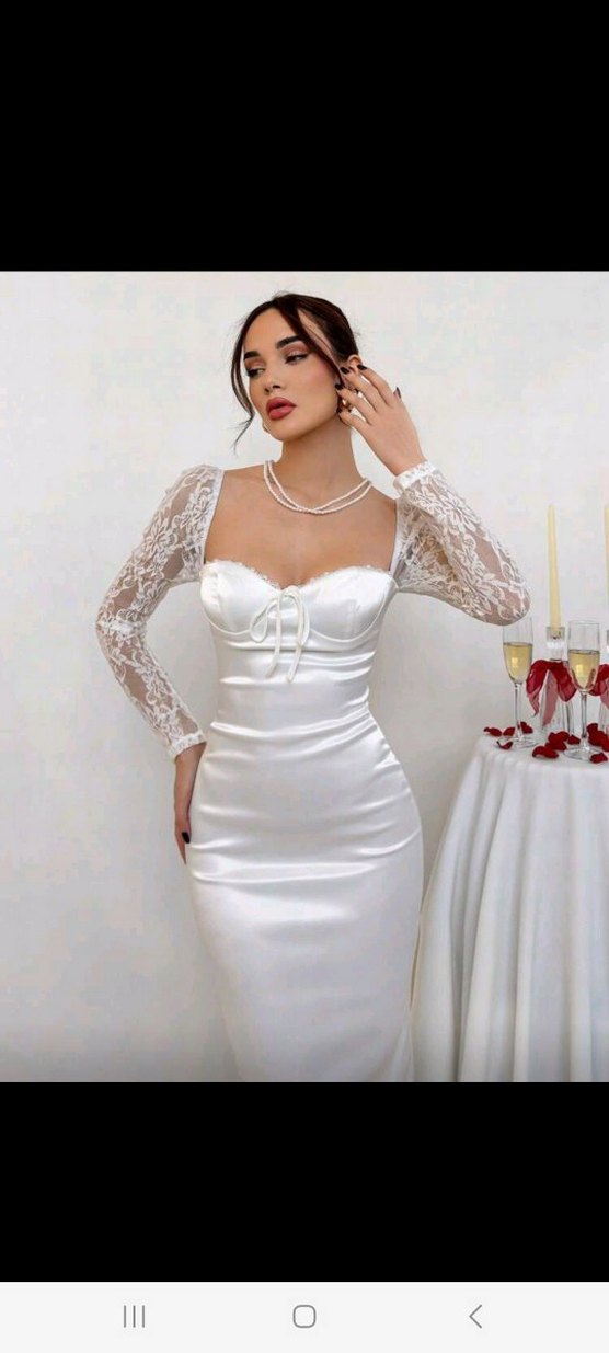 Fitted kesim, uzun beyaz abiye elbise, straplez yaka ve dantel uzun kollara sahiptir. Düğün ve özel günler için uygundur.