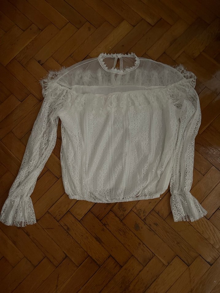 Beyaz bluz, uzun dantel kollu, yüksek yakalı ve bol kesimdir. Midi boyu ve ince örme kumaşıyla bohem tarzı yansıtır, davetler ve günlük kullanım için uygundur.
