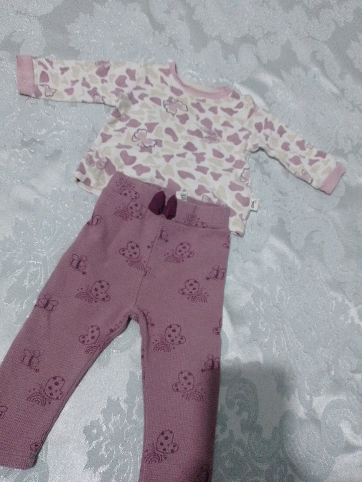 Dantelli uzun kollu üst ve pastel pembe, kelebek desenli pantolondan oluşan bebek kız takımı. 9-12 aylık