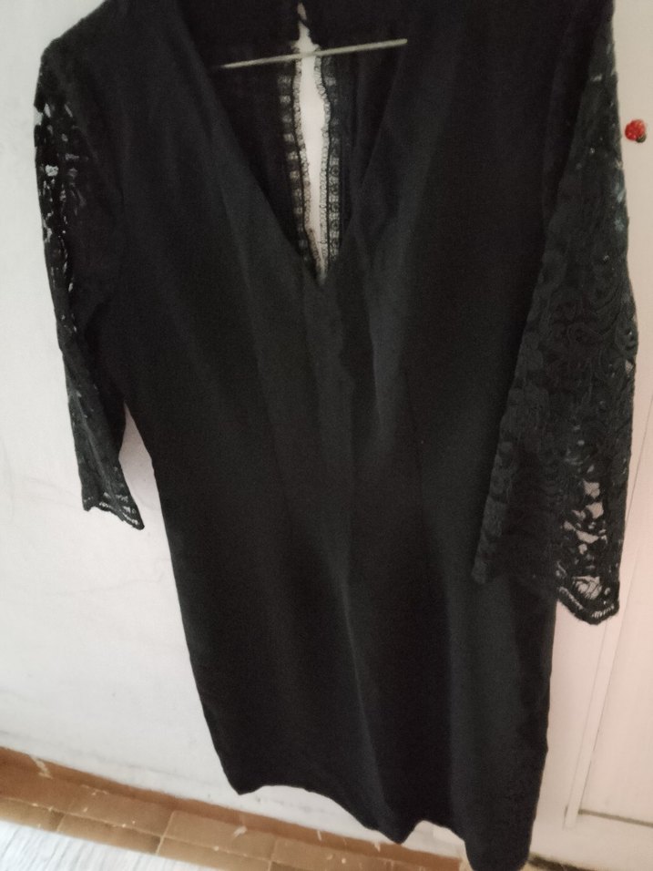 V yakalı, dantelli uzun kollu, siyah ve fit kesim gotik tarzda uzun elbise. Ofis için uygun şık bir parça.