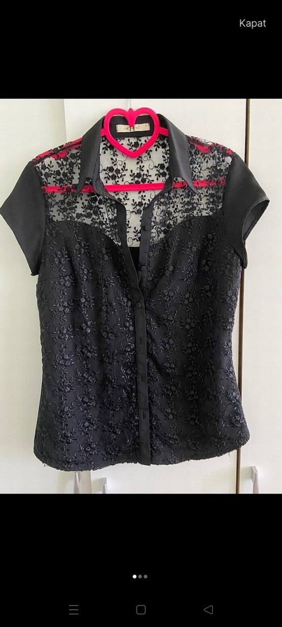 Kısa kollu, V yaka, dantelli siyah bluz, baskılı sentetik kumaştan. Ofis için uygun, cesur goth tarzında.