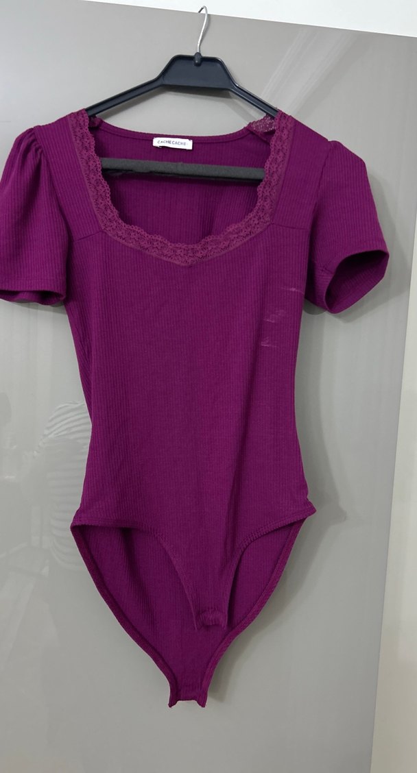 Mor renkte, dantelli V yaka ve kısa kollu, vücuda oturan kadın bluzu. Yumuşak sentetik kumaştan, günlük kullanıma uygun rahat ve cesur tarzda.