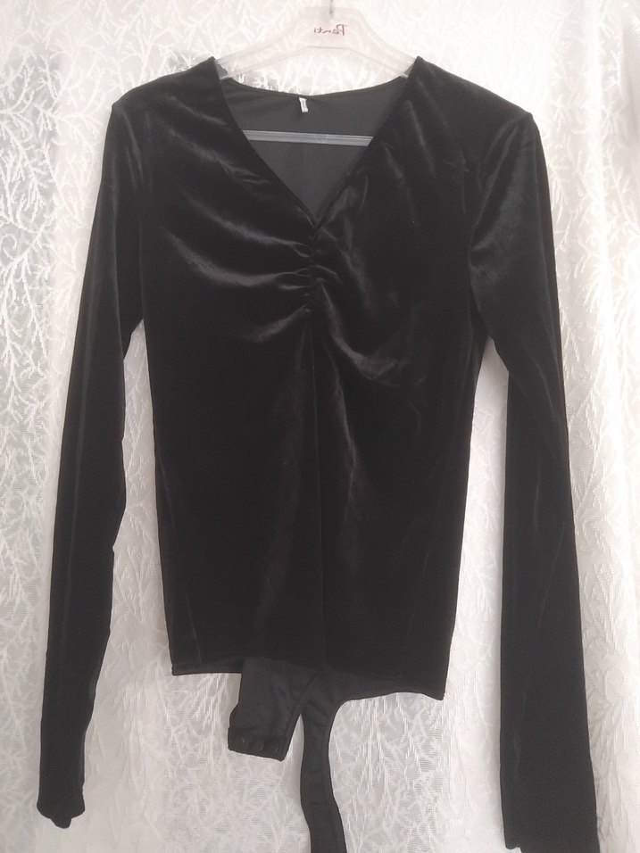 Dantelli V yakalı, uzun kollu, siyah ve fitted kesim kadın bluz