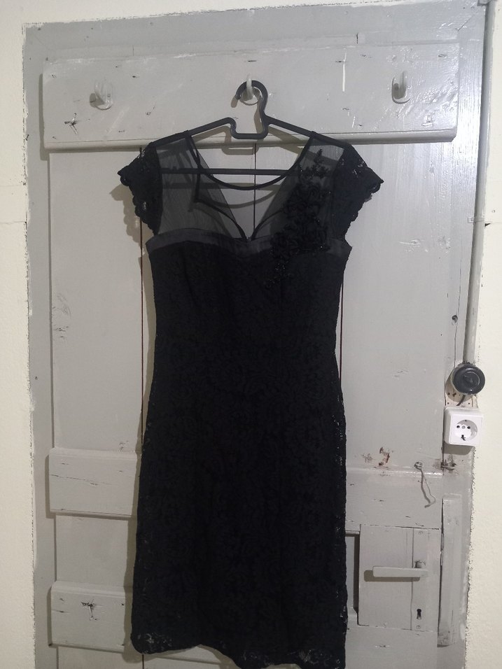 Dantelli ve V yakalı, askılı kollu siyah, vücuda oturan midi elbise. Gotik tarzda gece partileri için uygun.