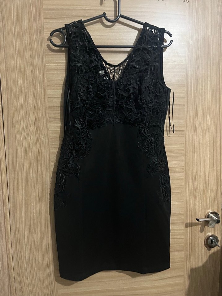 V yakalı, kolsuz, dantelli işlemeli detaylara sahip siyah, vücuda oturan midi elbise. Gotik tarzda, romantik akşamlar için uygun.