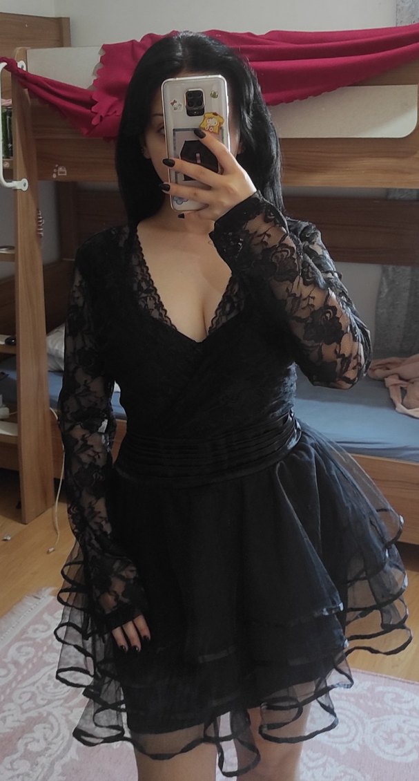 Siyah, dantel desenli uzun kollu, V yaka ve fitted kesime sahip gotik elbise, kabarık tüllü eteği var çok hoş gözüküyor s-m beden uyumlu