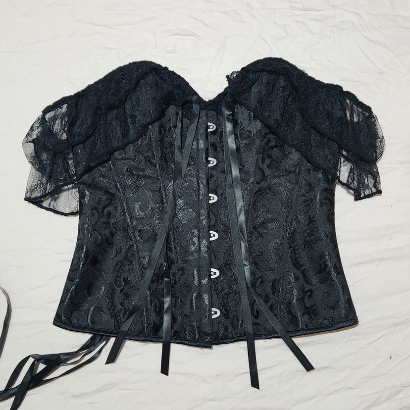 Siyah dantel düşük omuzlu, vücuda oturan gotik tarzda büstiyer. Sıfır Ürün.