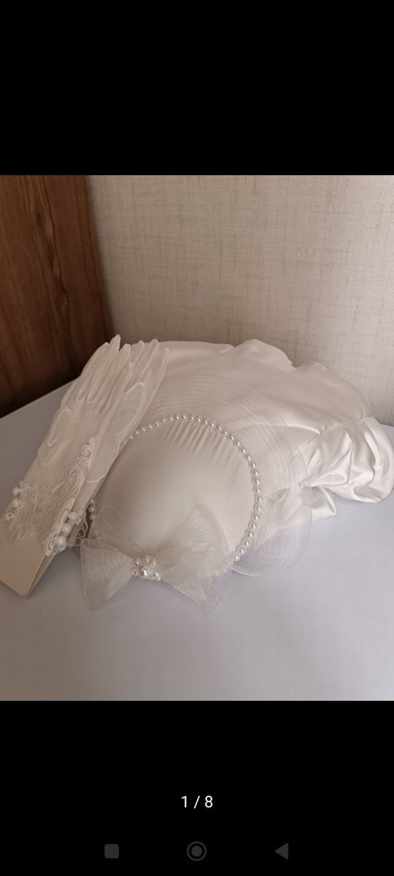Dantel işlemeli beyaz gelin eldiveni ve inci detaylı, fiyonk süslemeli şapka seti, klasik ve vintage tarzda saten medium tesettür elbise.( ŞAPKA VE ELDİVEN 1600 TL)