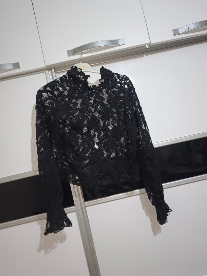 Dantelli Yüksek Yaka Siyah Mini Bluz