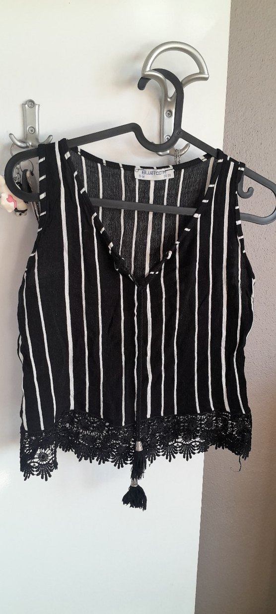 Kolsuz, siyah beyaz çizgili, V yaka ve bol kesim bluz. Etek kısmında püskül ve dantel detaylarıyla kısa boyda bohem tarz. s.m beden