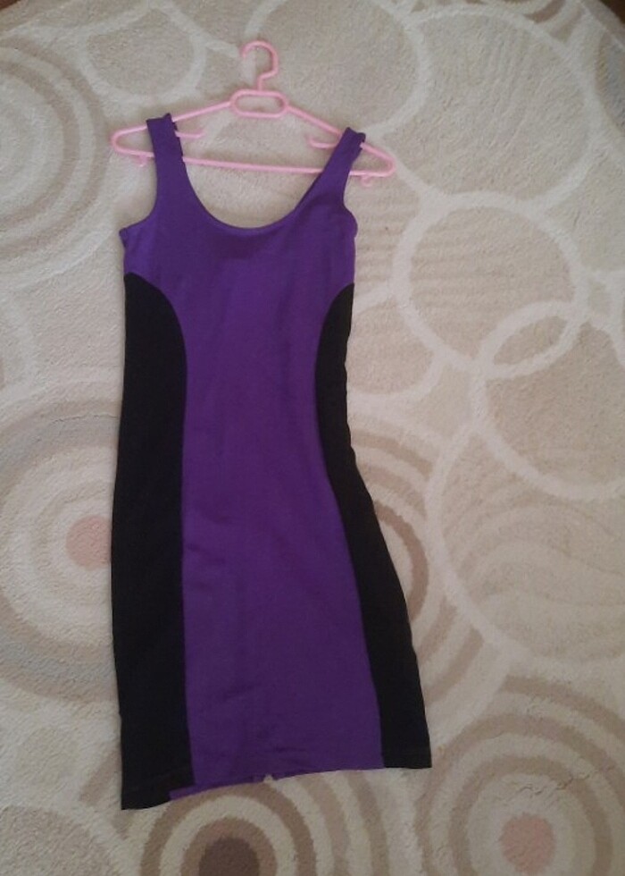Arkadan boydan fermuarlı mor ve siyah renk diz üstü elbise