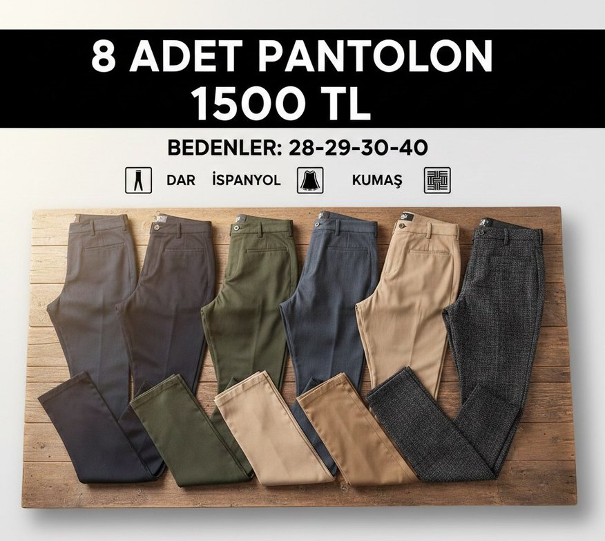 Dar İspanyol kesim, kemerli erkek pantolonlar sentetik kumaştan üretilmiştir. 28-40 beden aralığında, çeşitli nötr renklerde ve normal boydadır. Günlük kullanıma uygundur.