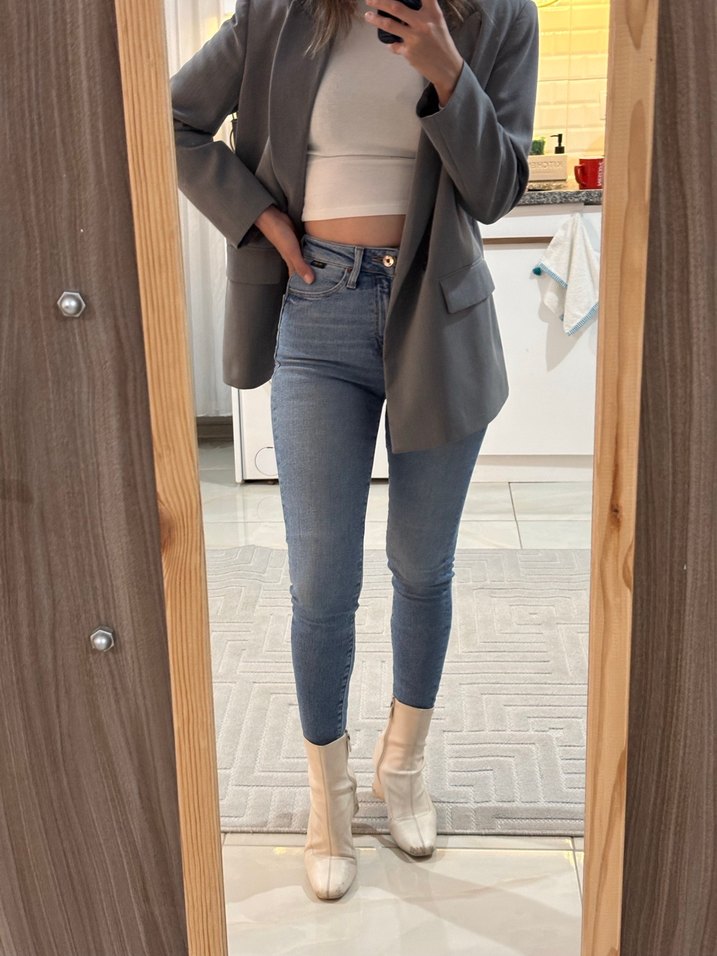 Gri renkli, dar kesim uzunluğunda kot pantolon. Günlük kullanıma uygun, sade ve şık tasarım sunar.