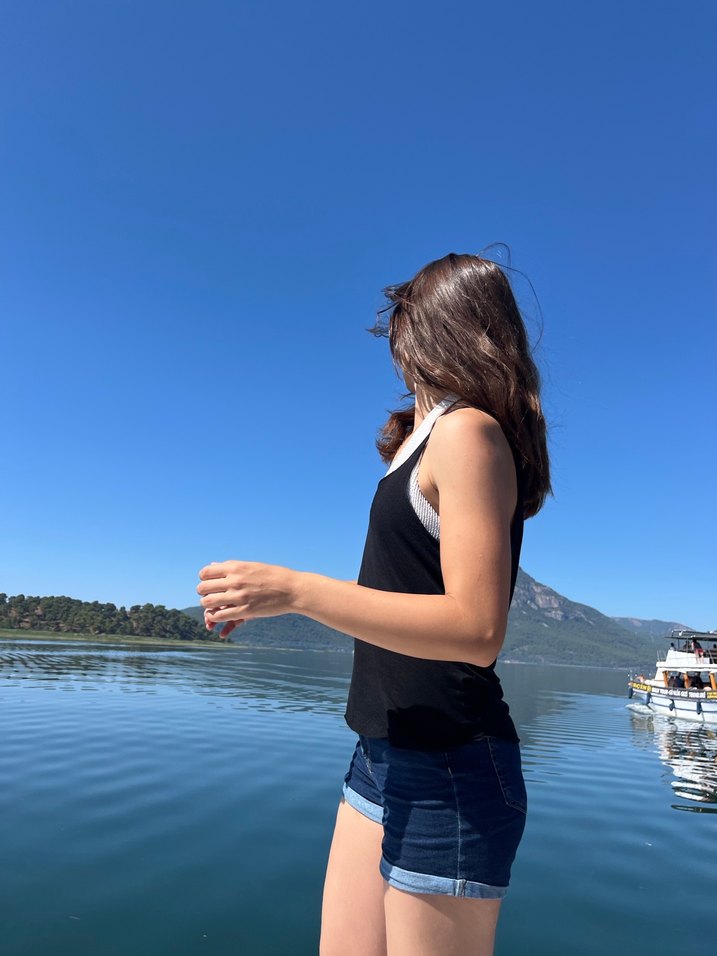 Dar kesim, koyu mavi renkte mini boy kot şort, kıvrımlı paçalarla. Günlük kullanıma uygun
