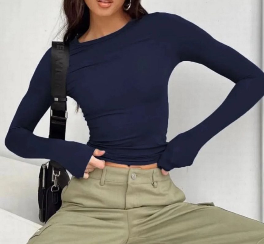 Dar kesim, uzun kollu ve bisiklet yaka lacivert bluz, düz ve midi boyda. Günlük kullanıma uygun, rahat ve şık bir tasarım sunar.