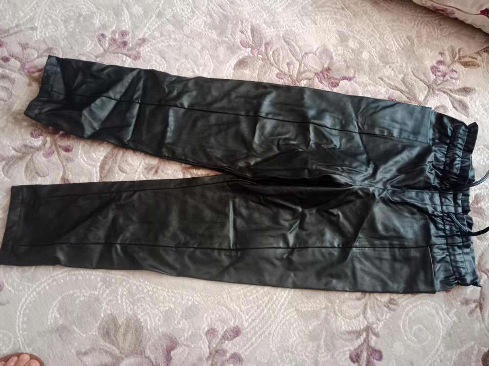 Dar kesim, uzun siyah deri pantolon, kemerli bel ile, günlük kullanıma uygun desensiz tasarım. bacak boyu 92 cm . m beden de olur