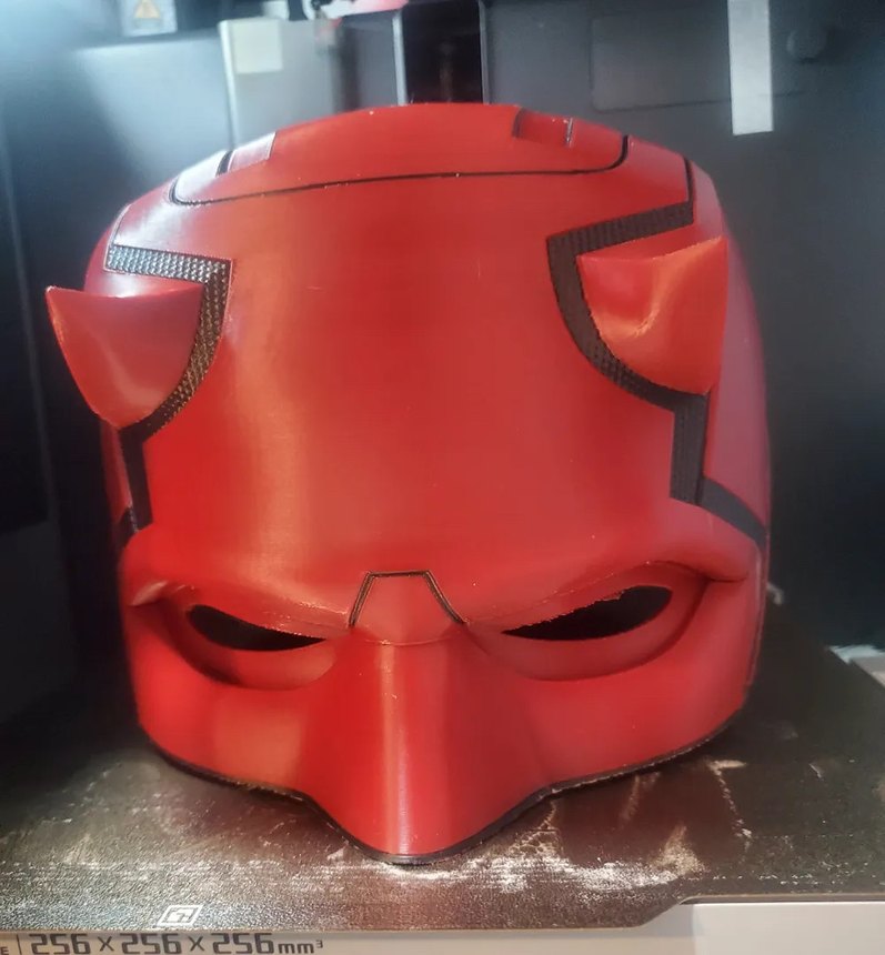 Koyu kırmızı renkte, siyah detaylı, keskin hatlara sahip aksiyon figürü maskesi. Daradevil
