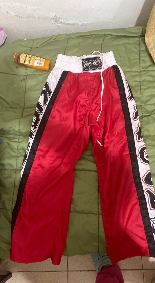 Kicboks müsabaka şort Beli lastikli Bu dar kesim sokak stili pantolonlar, renkli kırmızı batik desen ve fermuarlı detaylara sahiptir. Sentetik kumaştan üretilmiş, belde bağcıklıdır ve üzerinde 'RAGON' yazısı bulunur. ♂️