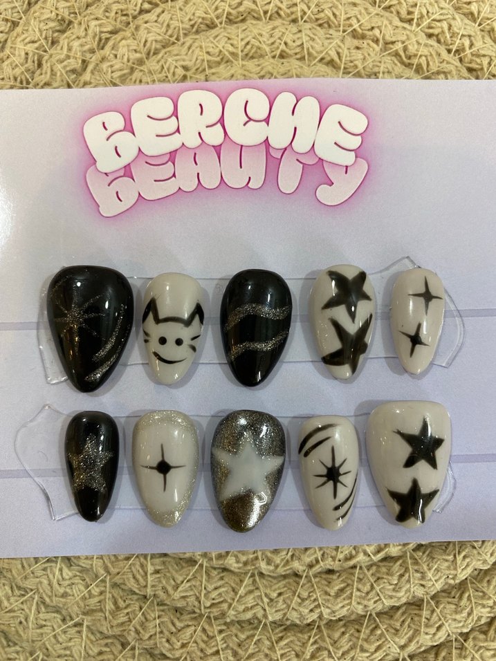 Yıldız ve gülen yüz desenli siyah-beyaz tırnak süsleri, ışıltılı detaylarla eğlenceli bir görünüm sağlar. %100 el yapımıdır. 10lu olarak gönderilmektedir. Kalıcı oje ve jel ile hazırlanmaktadır. Kendi ölçünüze göre sipariş verebilirsiniz ♀️