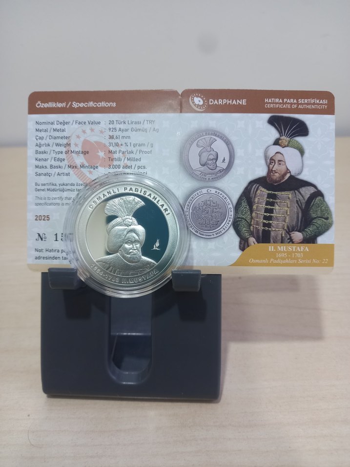 Darphane tarafından üretilen bu altın hatıra para, Osmanlı Padişahı II. Mustafa'yı tasvir eder ve orijinallik sertifikası içerir. 31,4 gram ağırlığında, 925 ayar gümüşten yapılmıştır. Sınırlı 3.000 adet. ✨