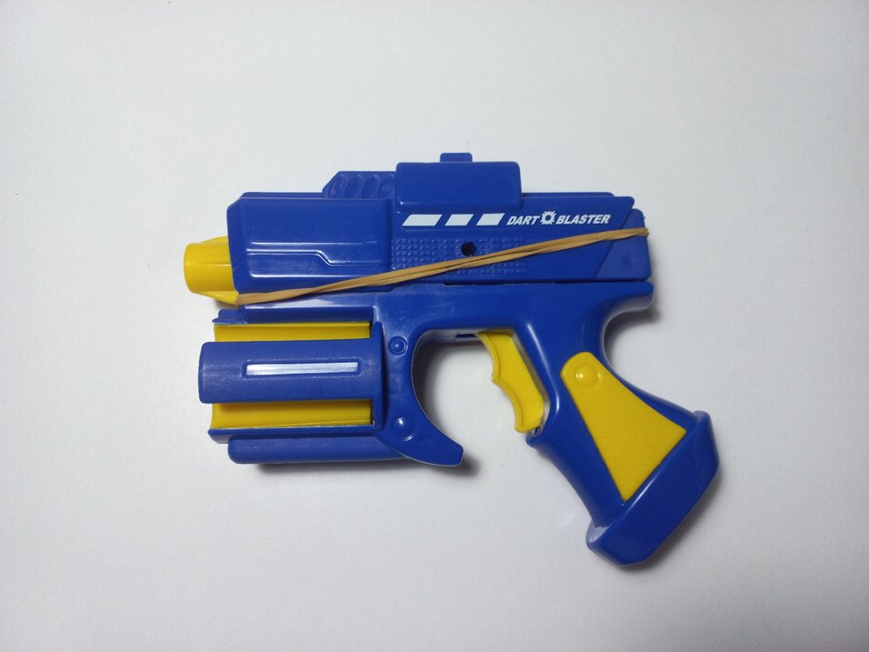 Mavi ve sarı renklerde,5 adet haznesi var. dart ( sünger mermi) atan oyuncak tabanca. Oyun zamanı için uygun. Lastiğin amacı bozuk olması değil mekanizmanın daha iyi olması içindir dileyen onsuz da kullanabilir.