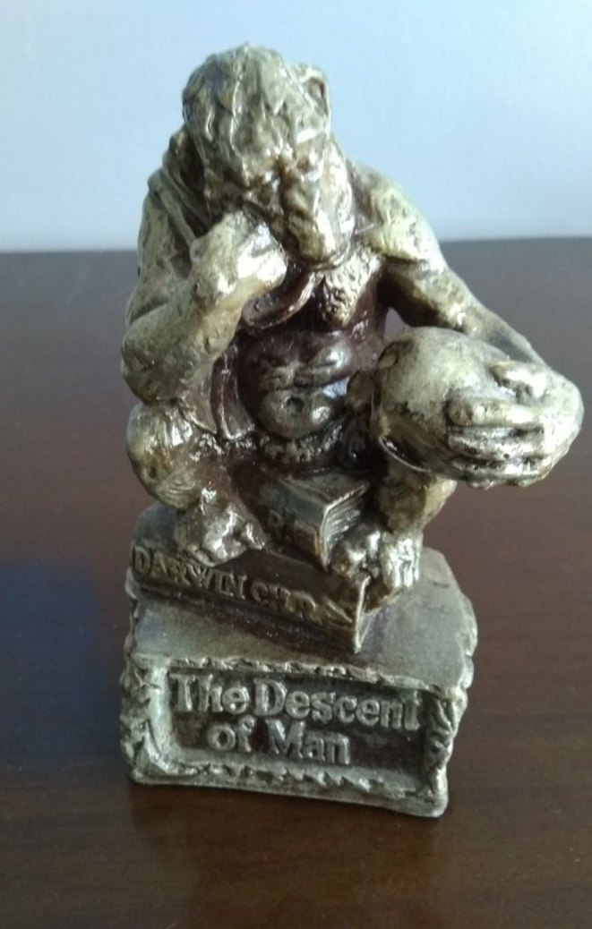 Bu heykel, Almanya doğumlu heykeltıraş Wolfgang Hugo Rheinhold tarafından 1893 yılında yapılıp şuan Ahşap Berlin Güzel Sanatlar Sergisi’nde sergilenen "Affe mit Schädel" (Almanca: "Kafatası ile Maymun") adlı bronz bir eserin popüler bir yeniden üretimidir. 17 cm boyunda, 730 g ağırlığında, elinde insan kafatası tutan düşünür pozunda tasarlanmış bu dekoratif heykel en az 30-40 yıllıktır. Charles Darwin'in “The Descent of Man” temasına sahiptir. Koleksiyonluk bir reprodüksiyon. Sorunsuz ve sağlam durumdadır.