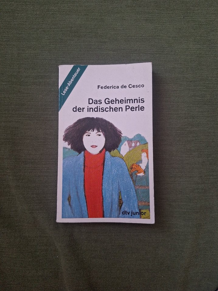 Federica de Cesco'nun yazdığı "Das Geheimnis der indischen Perle" adlı roman, kapakta genç bir kadını gösteriyor. dtv junior serisine ait.