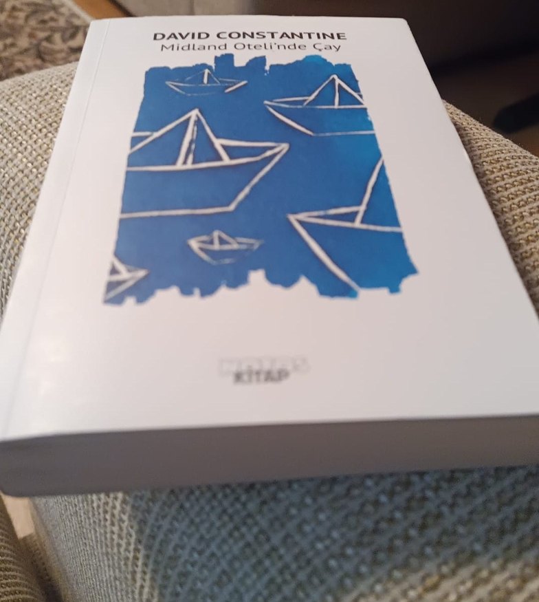 David Constantine'ın 'Midland Oteli'nde Çay' adlı kitabı, mavi ve beyaz teknelerle süslenmiş bir kapak tasarımına sahip bir sanat kitabıdır.