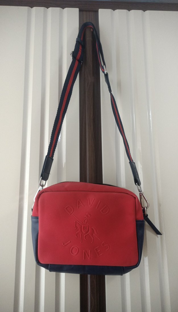 David Jones kabartmalı logolu kırmızı deri çapraz çanta, fermuarlı kapama ile günlük sokak ve athleisure tarzına uygundur. bir iki kere takıldı sifir ayarinda spor kombinlere çok yakışan bir model.